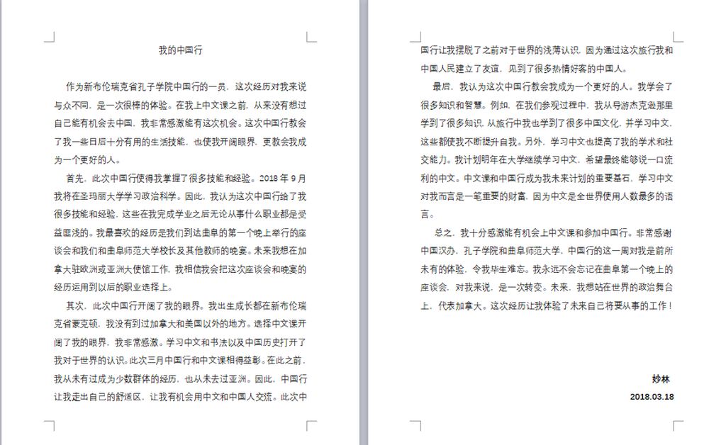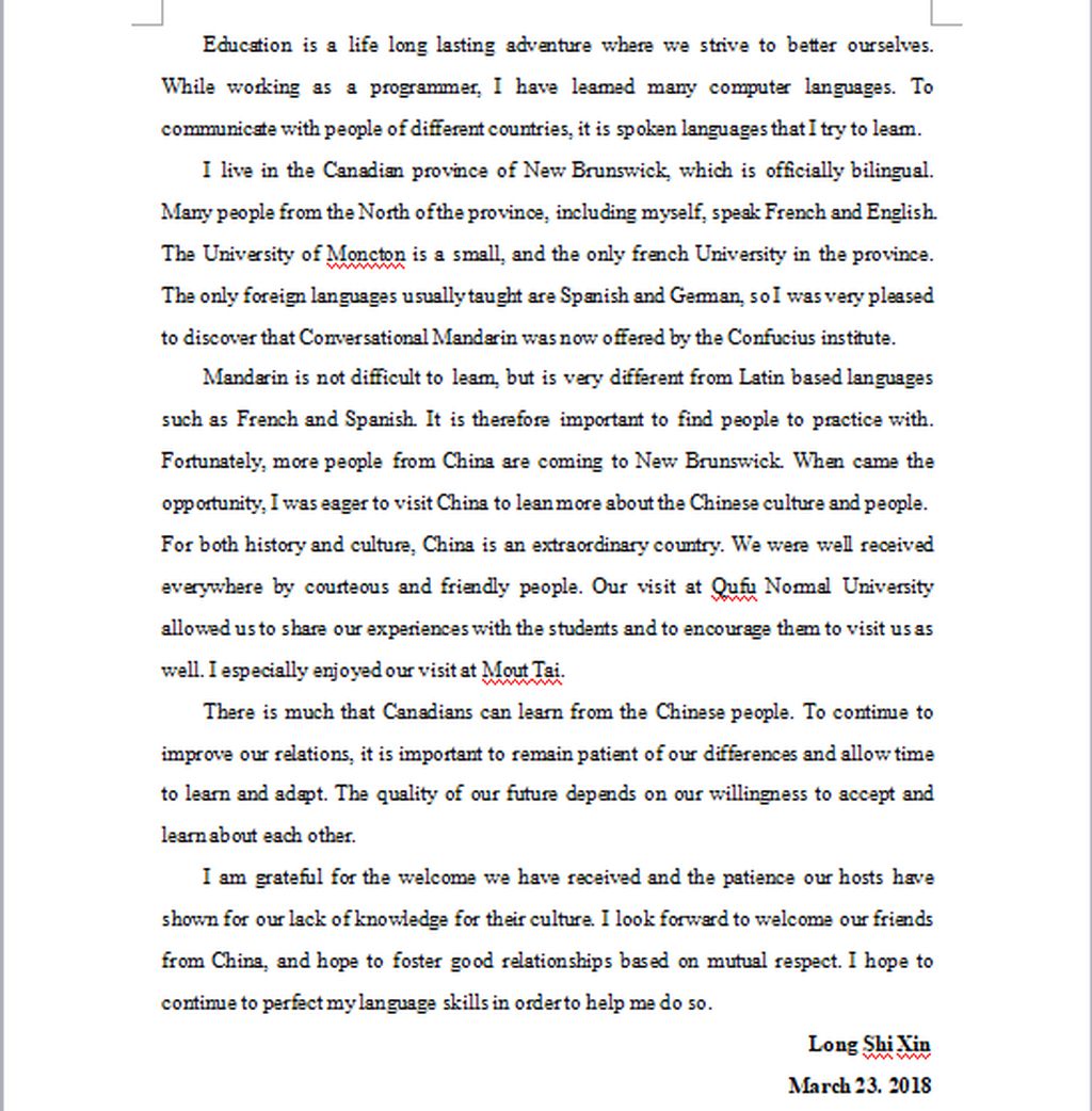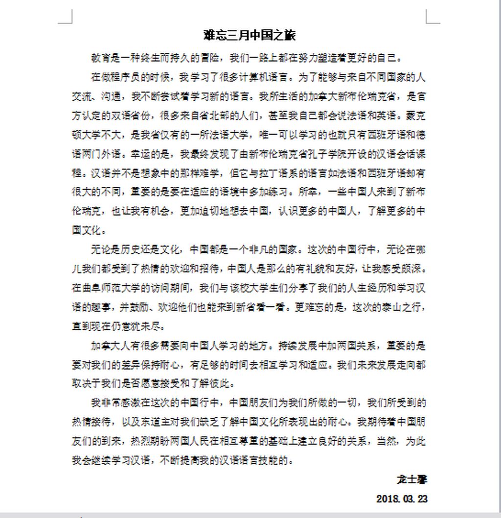 在曲阜师范大学参观访问的过程中,曲阜师大和孔子学院为参观团成员举办了一场特殊的交流活动,500名学生齐聚会议厅,欢迎加拿大访华团的到来。Brennen Lane回忆道,看到礼堂里坐满了人,每名成员都很紧张,他尝试突破自己,勇敢地展示自己学过的中文。中国学生们的热情让他逐渐进入状态,他与学生们畅谈,回答他们提出的问题,他说:“多么奇妙的一次经历啊,能够与中国学生进行一对一的交谈,没有语言障碍来阻碍我们之间的交流和对话。”