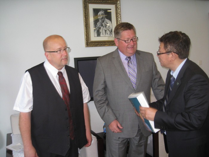 4. 2013年7月新省教育厅副厅长一行参观汉办并向马箭飞副主任递交新省孔院第二个五年的续签协议。The Deputy Minister of Education Mr. John McLaughlin presenting the Agreement to the Deputy Dean Mr. MA Jianfei.