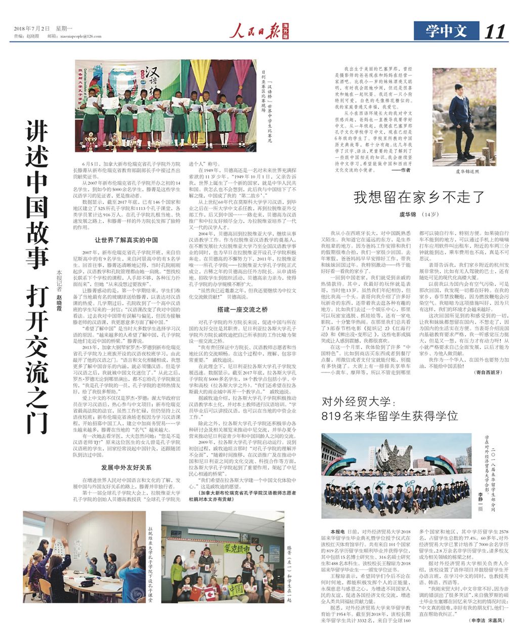 1. On July 2nd, Beijing time, People's Daily (overseas version) published a news article entitled “Telling Chinese Stories to Open the Door of Communication”. The article focuses on the development of CINB, and the contribution of the directors of the Confucius Institutes like Teng Jing to developing a friendly relationship between China and foreign countries and promoting the world's understanding of the real China. It is as Teng Jing said: "More and more people want to know China, and the Confucius Institutes are their bridges to China."