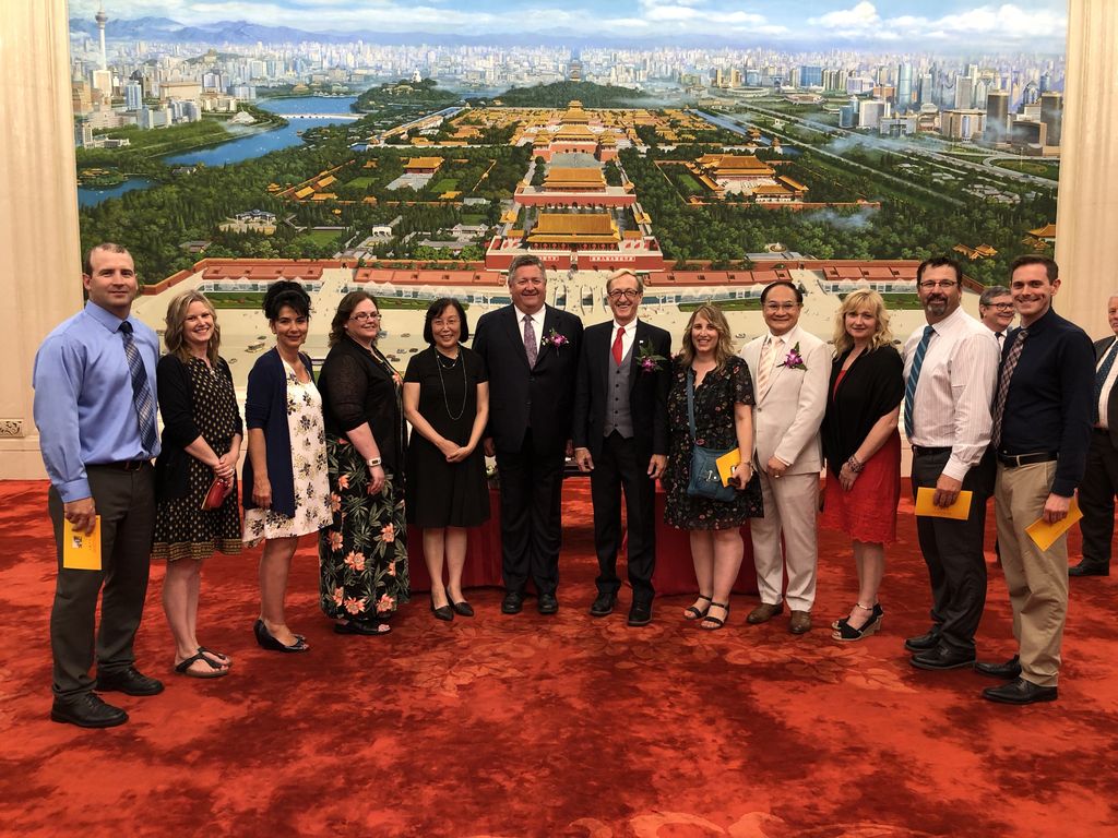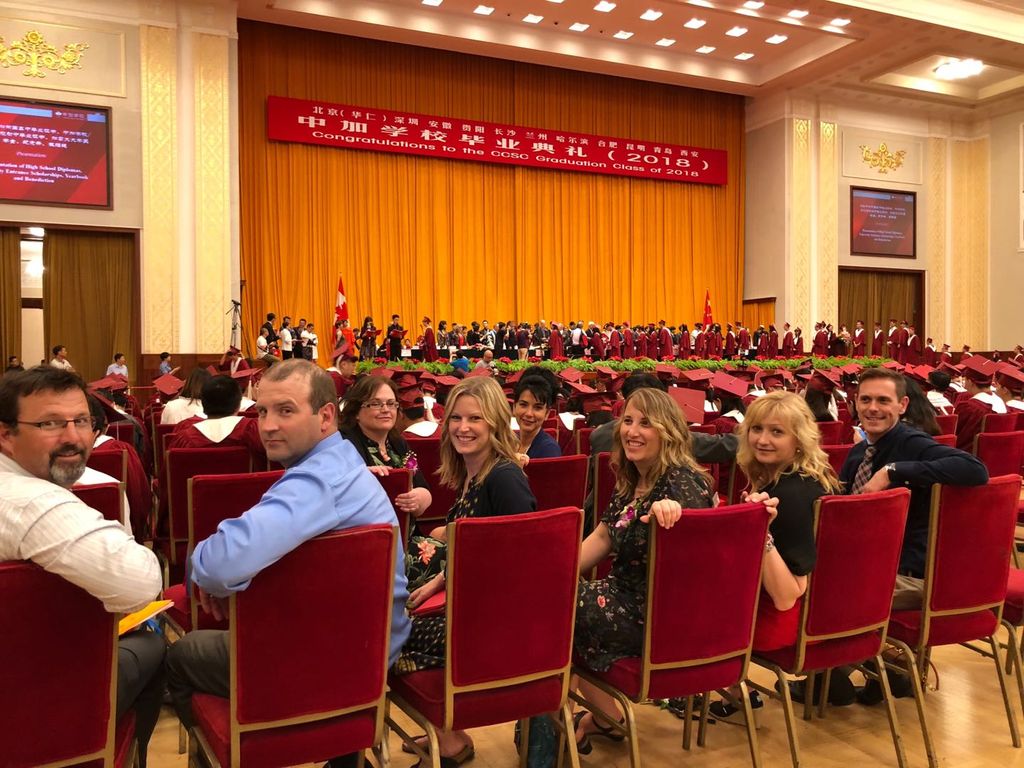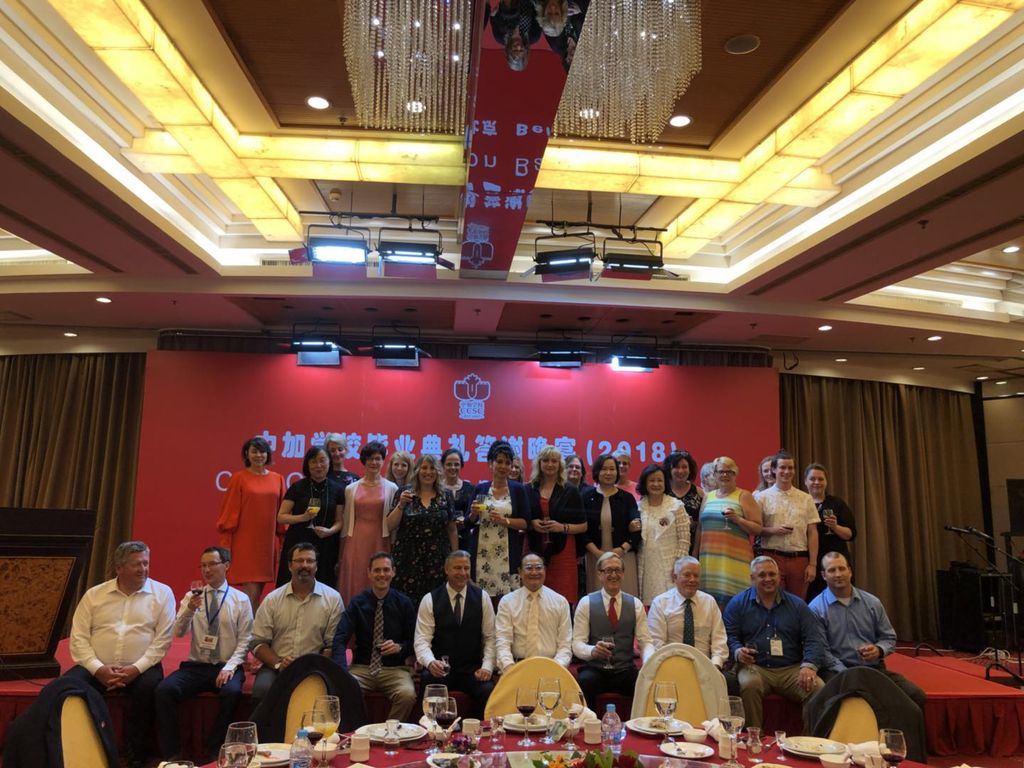 7、 7月7日,滕菁带领校长团一行在人民大会堂出席了中加学校毕业典礼,见证了数百位优秀学子成长道路上的重要时刻,他们中很多人将会从这里走出中国,走向世界。中加学校一直致力于培养具有“中华情怀、国际视野、生态文明、勇于创新、领导才能、服务社会”的国际化人才。出席典礼的还有新省教育部副部长、孔院理事长John McLaughlin和大西洋国际教育集团副总裁、新省孔院执行理事Dawn Weatherbie。