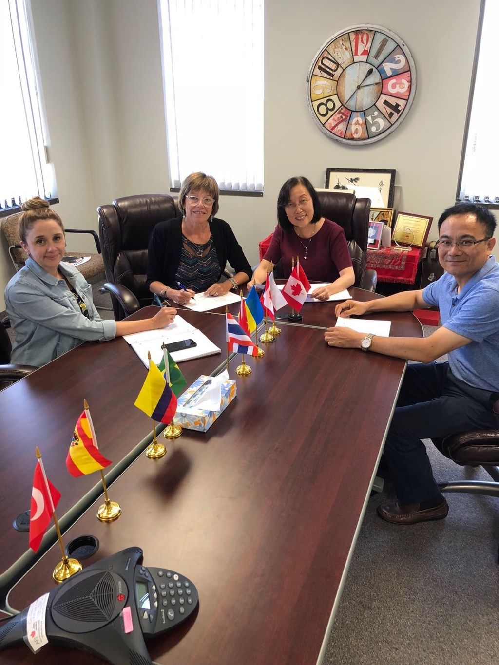 18、 当地时间7月25日,教学总督导滕菁和中方院长代尊峰在弗莱AEI总部与Dawn Weatherbie、 Jennifer Graham以及Lilian Ketch举行了每月例会。会上滕菁就校长团中国行、新学年汉语教师安排、汉语教学大纲修订、加拿大孔子学院联席会议等事项作了汇报。8月29日再次在AEI召开会议,就新学年四个学区汉语教师的教学安排以及9月孔子学院日和中秋节、11月圣诞花车游行、12月全球孔院大会和孔院理事会会议等工作进行了部署。