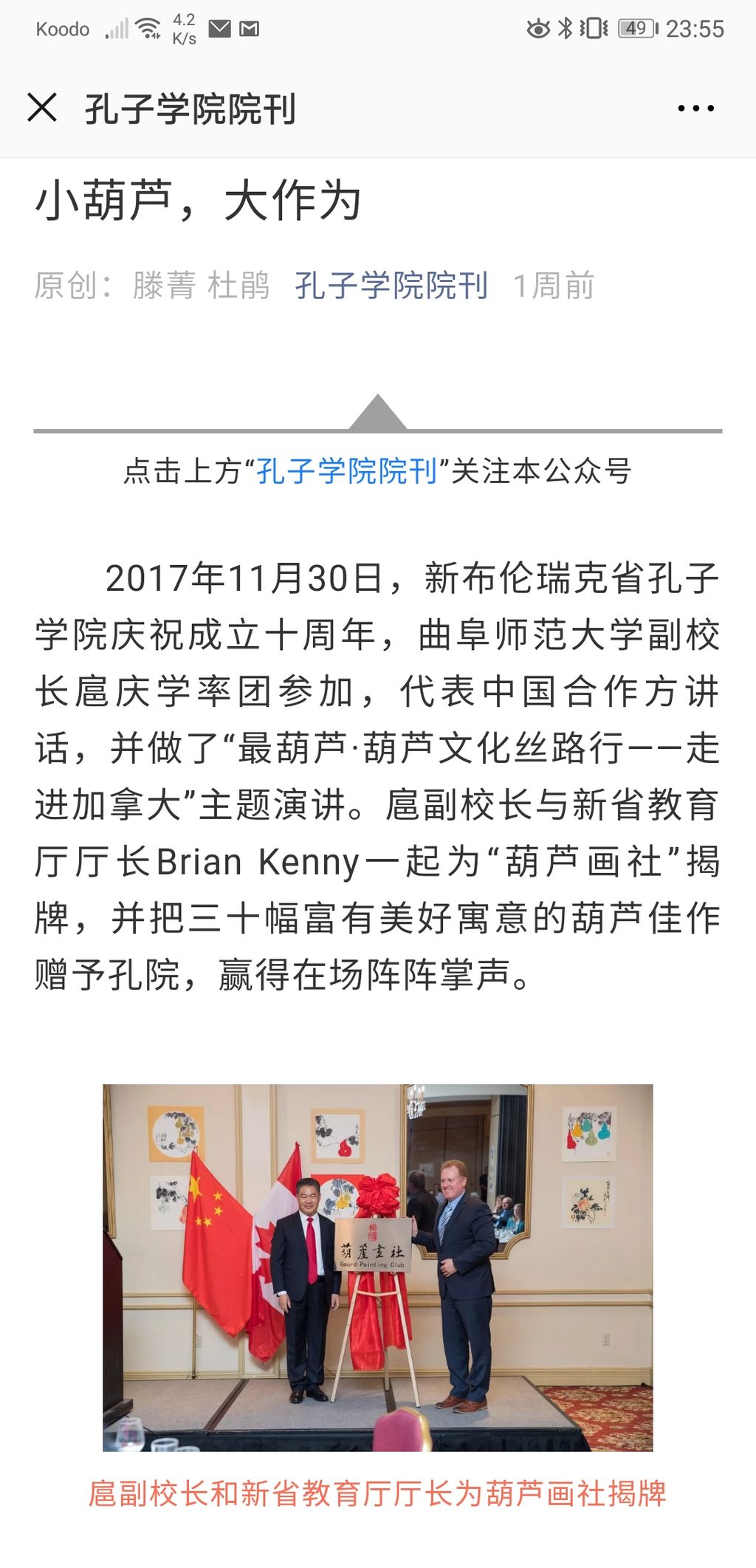 On October 21st, the article Little Gourds Make Big Things Happen by Teng Jing and Du Juan was published in the publication of Confucius Institute. This article told the story of gourds conveying sincere feelings between the Canadian father and son and Hu Qingxue, vice president of Qufu Normal University, which was witnessed by Teng Jing. It was a vivid portrayal of the cultural exchange between the East and the West, and was also the best example of the bridge role the Confucius Institute played.