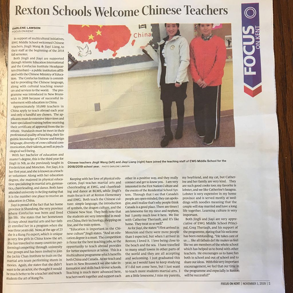 On October 22nd, Wang Jingli, a Chinese teacher, and Liang Jiayi, a volunteer teacher, were interviewed by Darlene Lawson, a journalist from the local newspaper Focus on Kent.