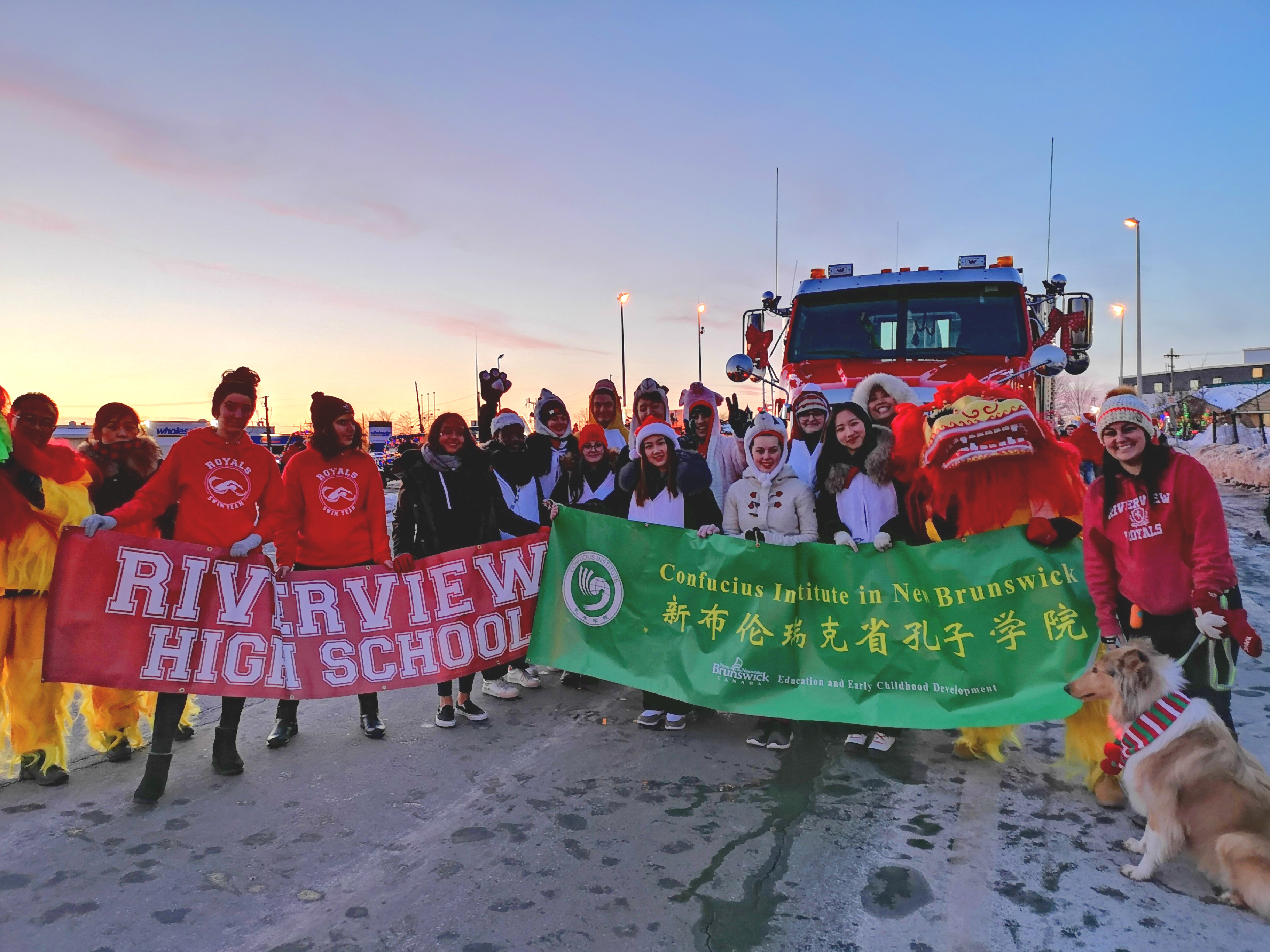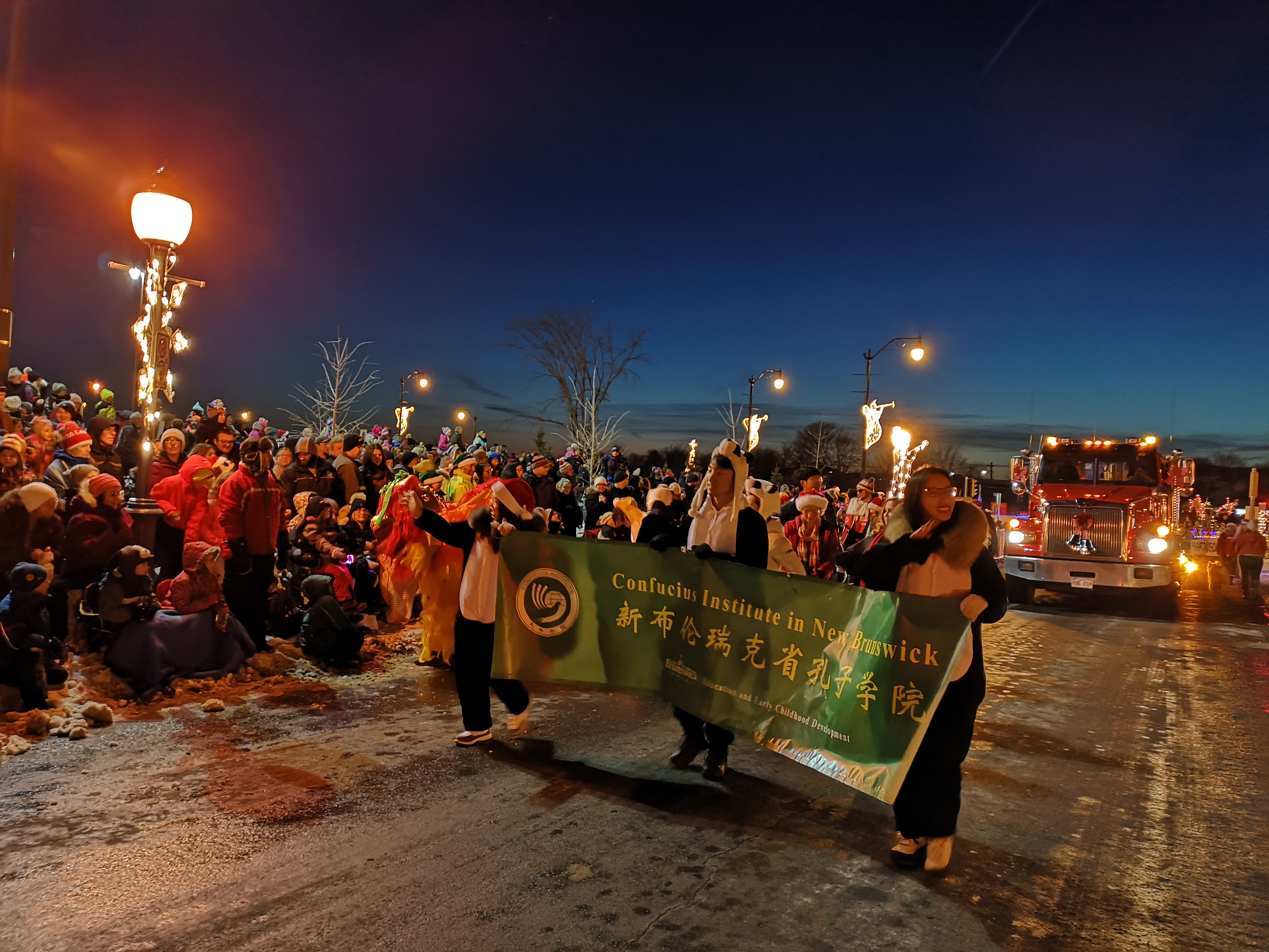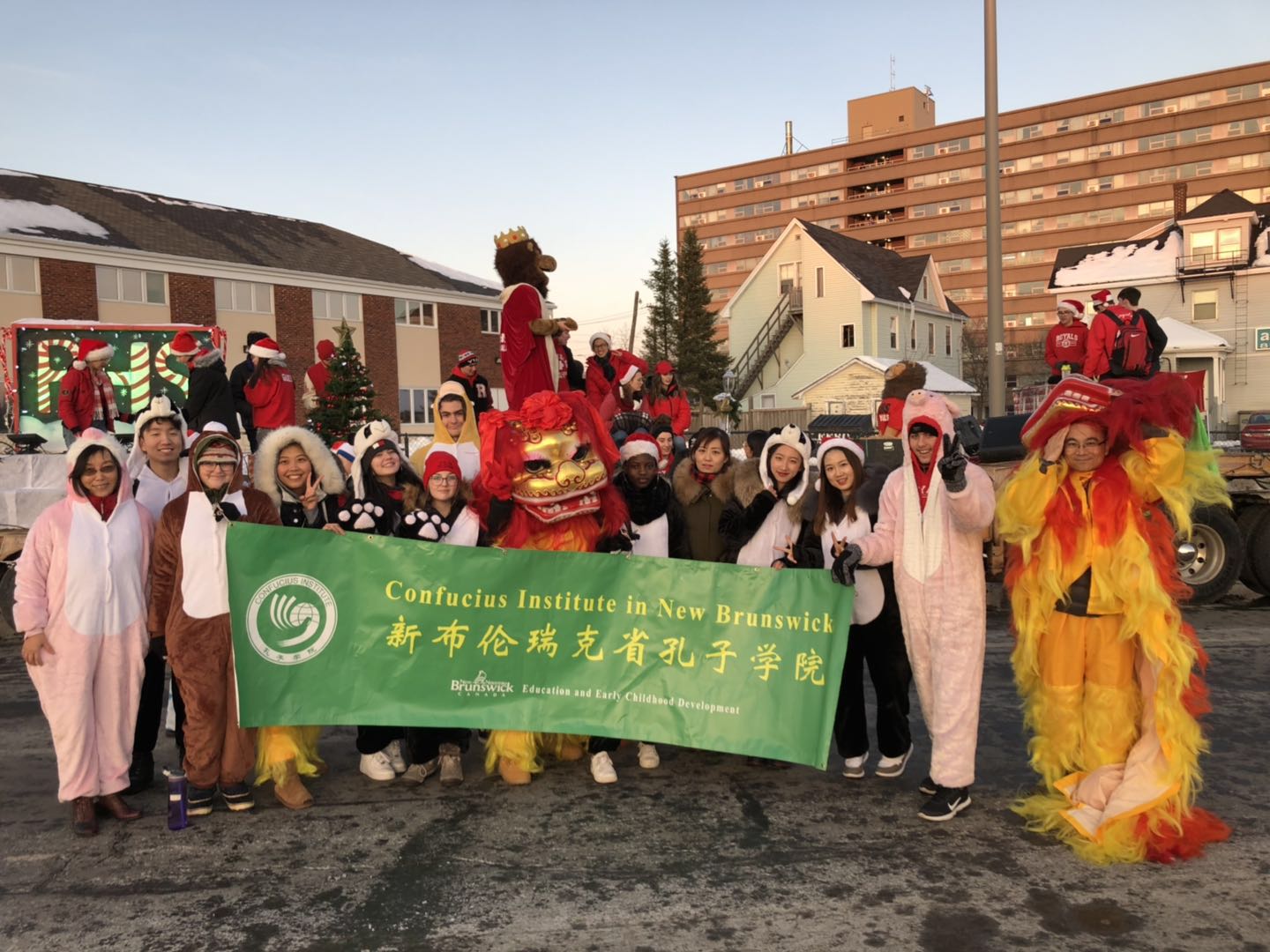 On November 24th, the Confucius Institute of New Brunswick participated in the annual “Santa Claus Parade” in Moncton. More than 100,000 people watched this event. 7 CINB teachers, some students in Chinese classes and Riverview High School cooperated jointly formed a team. Chinese lions, with their golden coats, graceful and awesome appearance, led the way ahead of the team, echoing the mascot lion of Riverview High School on the float. Seven pandas and twelve zodiac animals followed. The zodiac pig and dog symbolized the change between the New Year the past year.