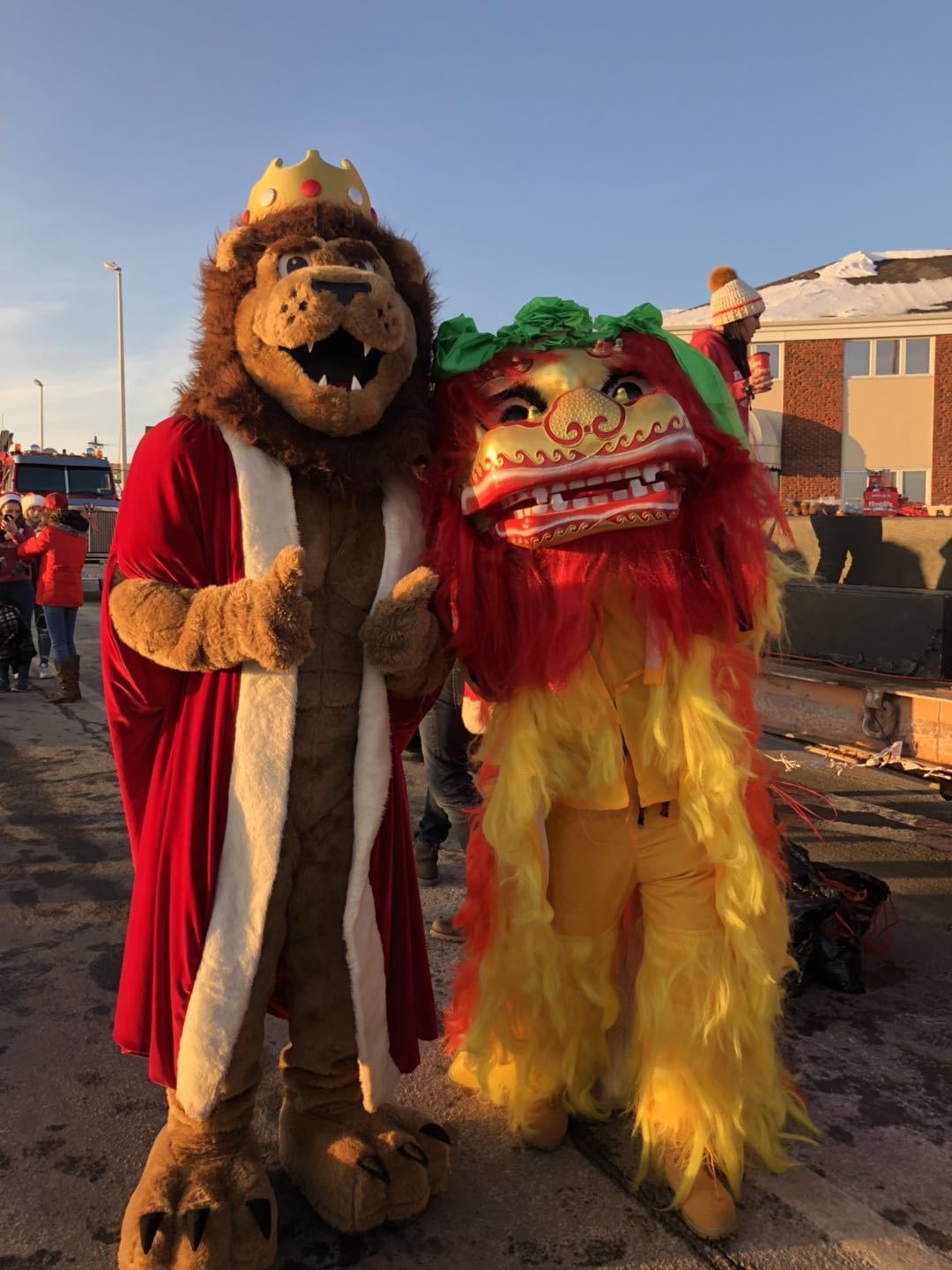 此次游行的大获成功既有曲阜师范大学所赠文教物品的“添翼”,更是孔院师生精心策划通力合作的结果。“战地记者”外方院长滕菁着生肖兔装扮,并全程统筹摄像,中方院长代尊峰和特地从弗莱赶来的志愿者陈至圣扛起狮头重任,道具闷热体会到了零下七度的室外汗蒸。汉语教师刘晓唯和李珊珊一直躬身在狮尾配合,虽是新手,四人组或昂首或俯身或转头或摆尾,表现出了中国狮的凛凛姿态;志愿者许梦可和孙小皎扮成熊猫,手持孔院横幅,同时组织学生与观众互动。高中生则使出浑身解数,满场跑动,调动观众热情,天气寒冷大家却乐在其中。