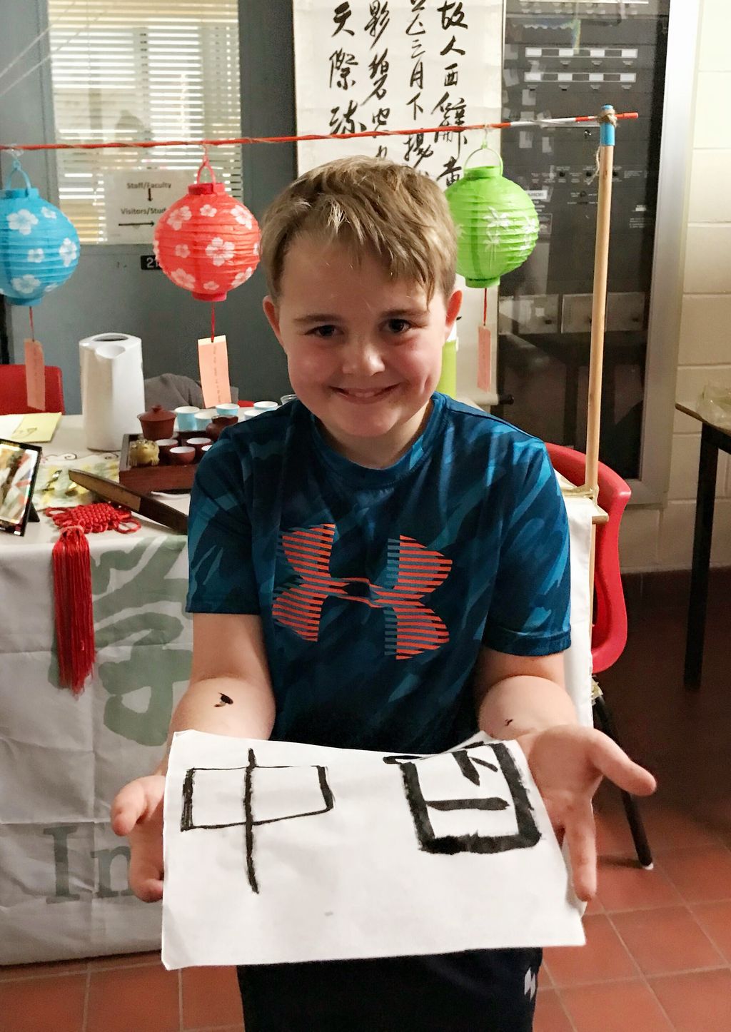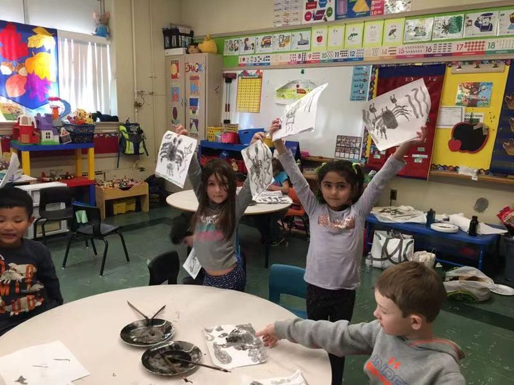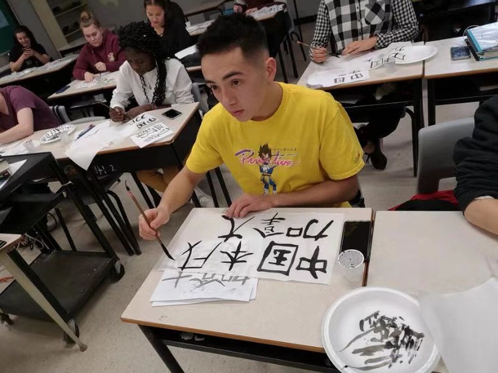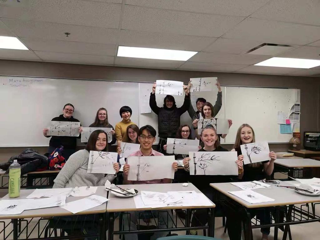 新省孔院聘请当地华人绘画爱好者梁丽霞到各教学点教授中国传统绘画。在小学,梁老师先为孩子们简单介绍了中国水墨画与西方油画的不同,并展示了自己的部分作品,引来学生的阵阵赞叹。后用通俗易懂的方法示范如何用毛笔绘出一只螃蟹,蟹肚、蟹须、蟹腿,寥寥几笔便跃然纸上。学生们在教师指导下小心翼翼地在宣纸边缘试色,调好浓淡后按照老师的方法绘图,领悟较快的学生已经兴奋地画出了一个螃蟹家庭。在高中则是如法教授了竹子和中国书法,学生们第一次在真正的宣纸上写下了“中国”和“加拿大”,画出了熊猫的美食竹子,成就感满满。
