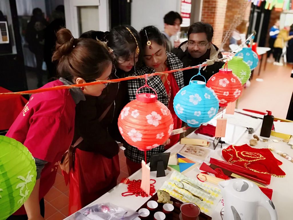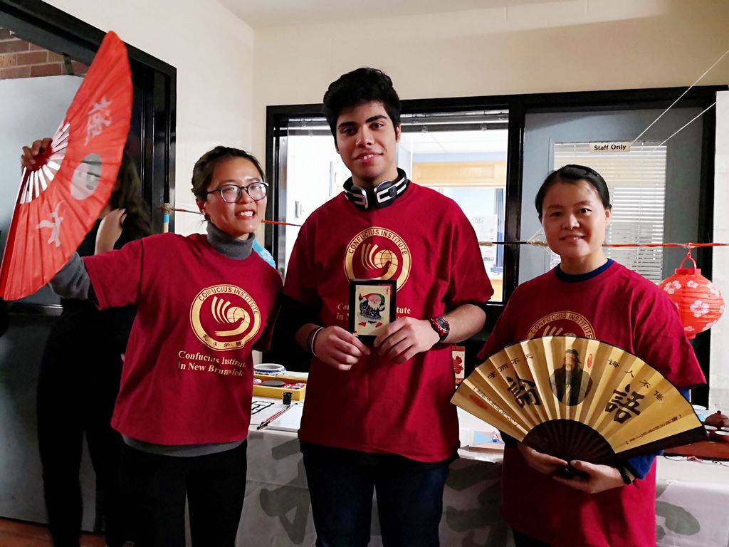 11月15日晚,新布伦瑞克省孔子学院汉语教师刘淑杰、李楠楠受邀参加圣约翰高中一年一度的“多元文化夜(International Night)”,同来自不同国家的社区组织开展了一场精彩的多元文化交流。新布伦瑞克省孔子学院是当晚唯一受邀展示中国文化的单位,答题得奖的灯谜区,茶香四溢的茶艺区,大展身手的书法区,益智有趣的游戏区……吃喝玩学一条龙的鲜明特色吸引了众多观众驻足体验。