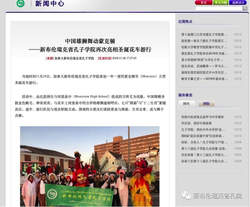 11月24日,新省孔院参加一年一度的蒙克顿市(Moncton)大型圣诞花车游行。国家汉办官网进行了报道。