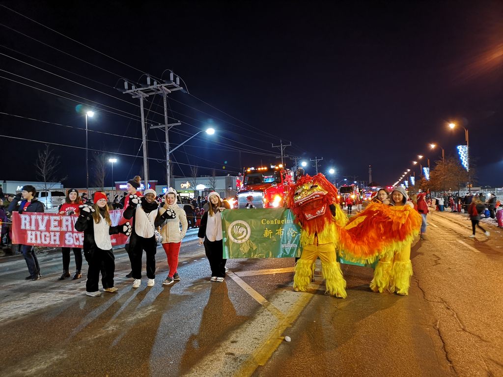 During the activity, the square array composed of teachers and students of CI and Riverview High School was particularly eye-catching. The Chinese dancing lions, with their golden coats and brilliant appearances, echoed the mascot lion of Riverview High School on the float. Seven “pandas” and twelve zodiac animals followed them. On the way, the parade team actively interacted with the audience. The children around cheered or clapped hands with pandas, zodiacs, or danced with lions. Eason, a high school student from Riverview High School who took part in the parade with CI for the first time, said excitedly, “It’s so interesting! Next year I will definitely attend it again. I want to learn Chinese too!”