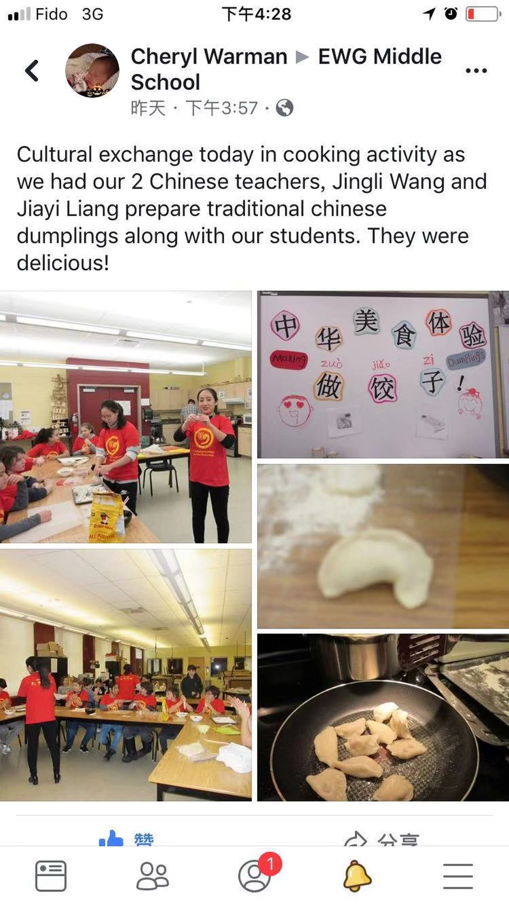 11月26日下午,汉语教师王静丽,志愿者梁嘉怡受社区学校协调员Cheryl Warman 女士邀请,在Eleanor W.Graham 中学为烹饪俱乐部学生举办了一场中华美食体验活动。饺子宴、中式炒饭给学生们带来了不同的美食文化体验。学生们在汉语教师的引导下一步一步地做饺子皮、包饺子和煮饺子,最后一起品尝、享受自己的烹饪成果。作为饺子的“初体验”,他们表示品尝像极了他们的最爱——当地Perogies(传统馅饼)。一名六年级学生Ethen说,“现在尝到了中国的饺子,很美味,我很喜欢。还发现了中加美食是有相通的,以后我想尝试更多的中国美食。”