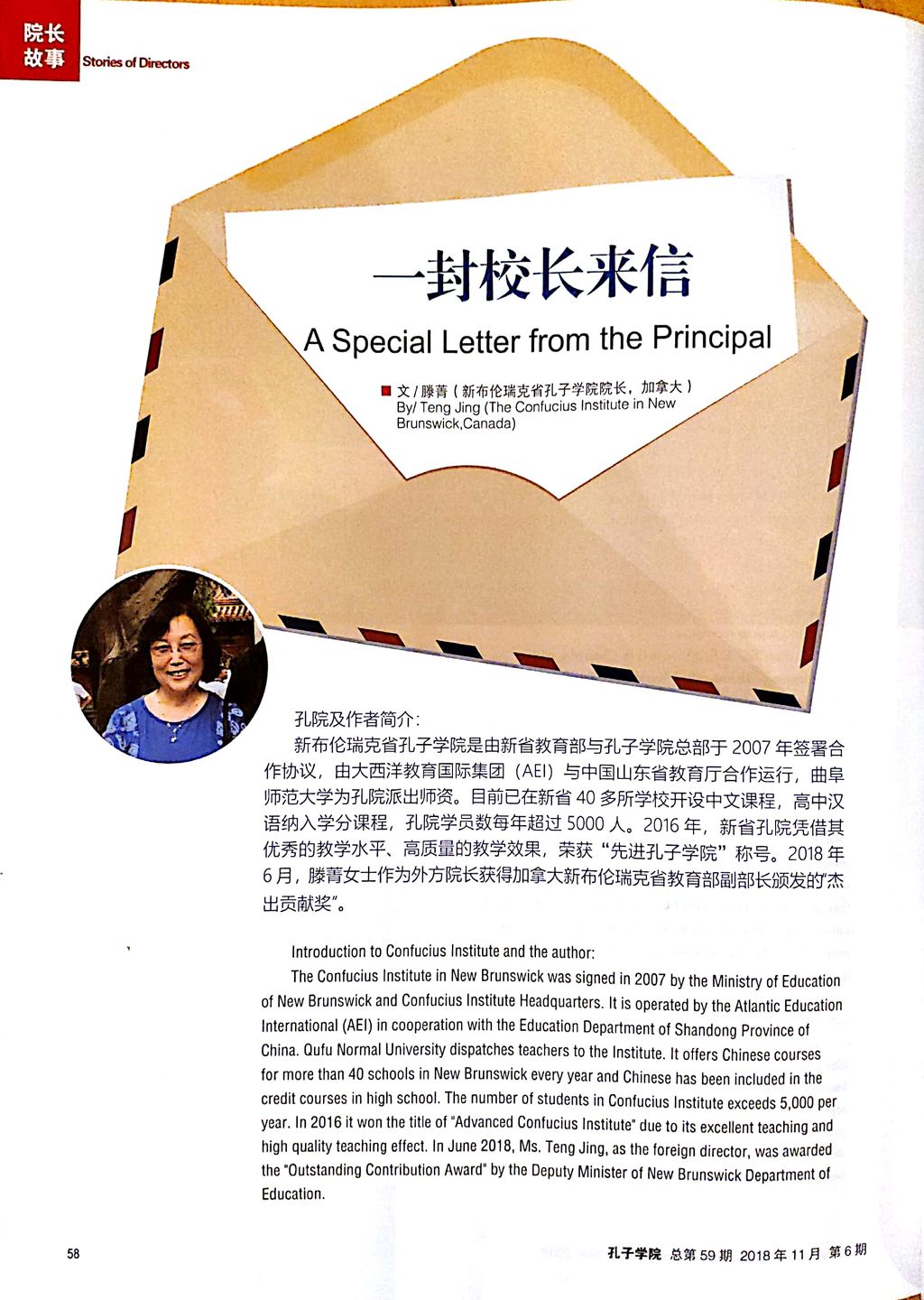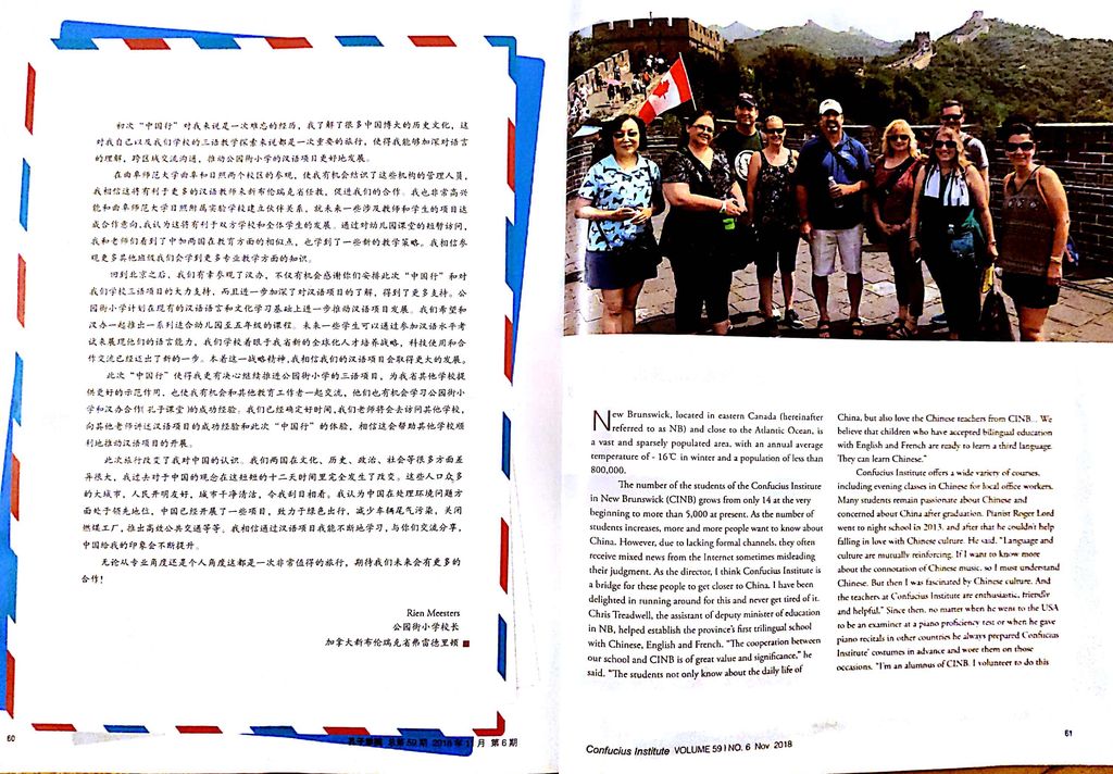 Teng Jing's article "A Letter from the Principal" was published in the 59th issue of Confucius Institute’s journal in 2018 in the column of “Stories of Directors”. This article introduced the situation of CINB by citing a letter from the principal of Park Street Primary School, a Confucius Classroom and trilingual school in New Brunswick, after his trip to China in July.