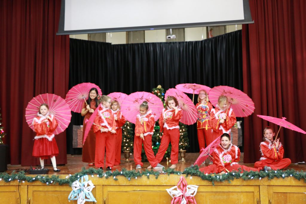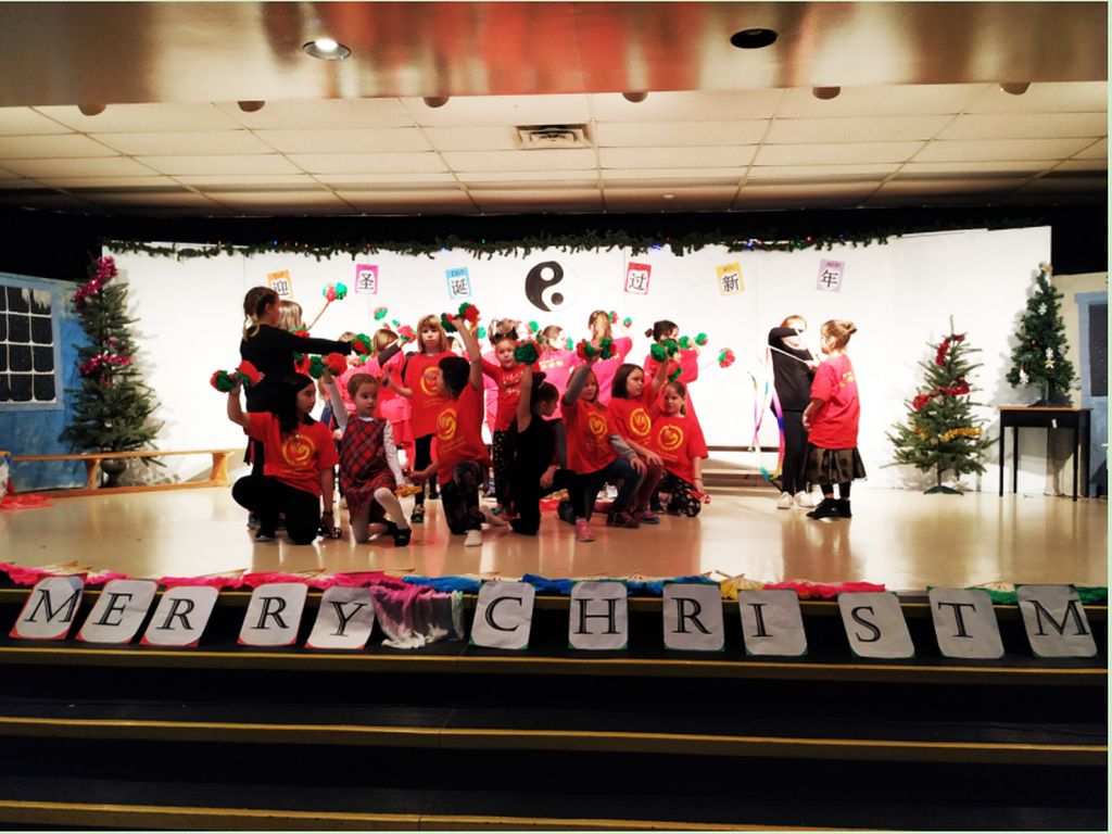 On December 19th, students from Chinese teacher Li Yanmei's Chinese class performed two traditional Chinese dances at Christmas party in Hubbard Elementary School. The children either held feather fans, acting like white cranes flying to show the combination of strength and softness of Chinese traditional culture, or were dressed in traditional Chinese costumes, holding up their umbrellas calmly and generously, with Chinese red to highlight the splendor of Chinese culture, which won a lot of applause.