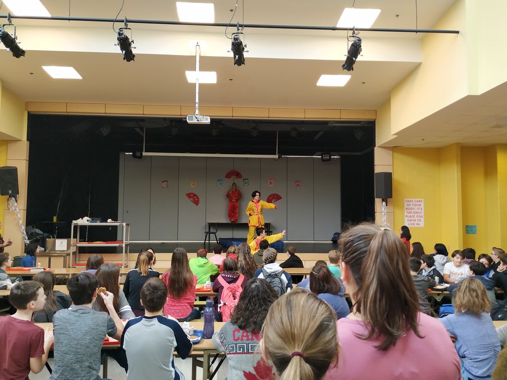 19日中午,正值Eleanor W. Graham中学的火鸡午餐日,梁嘉怡武术俱乐部学生Tyler,Xander和Carolina为全校学生带来了由三人自编自导的功夫戏剧表演。该戏剧是源于功夫巨星成龙的电影片段,问到学生们的灵感来源,Tyler说:“我以前从未接触过功夫,也不知道武术是什么。嘉怡老师让我多看一些中国的功夫电影,我就想到了我最喜欢的功夫巨星 Jackie Chan,他的电影很有意思,我想他是我的榜样”。戏剧表演结束后,三位学生带来了中国功夫表演,赢得了在场观众热烈的掌声。
