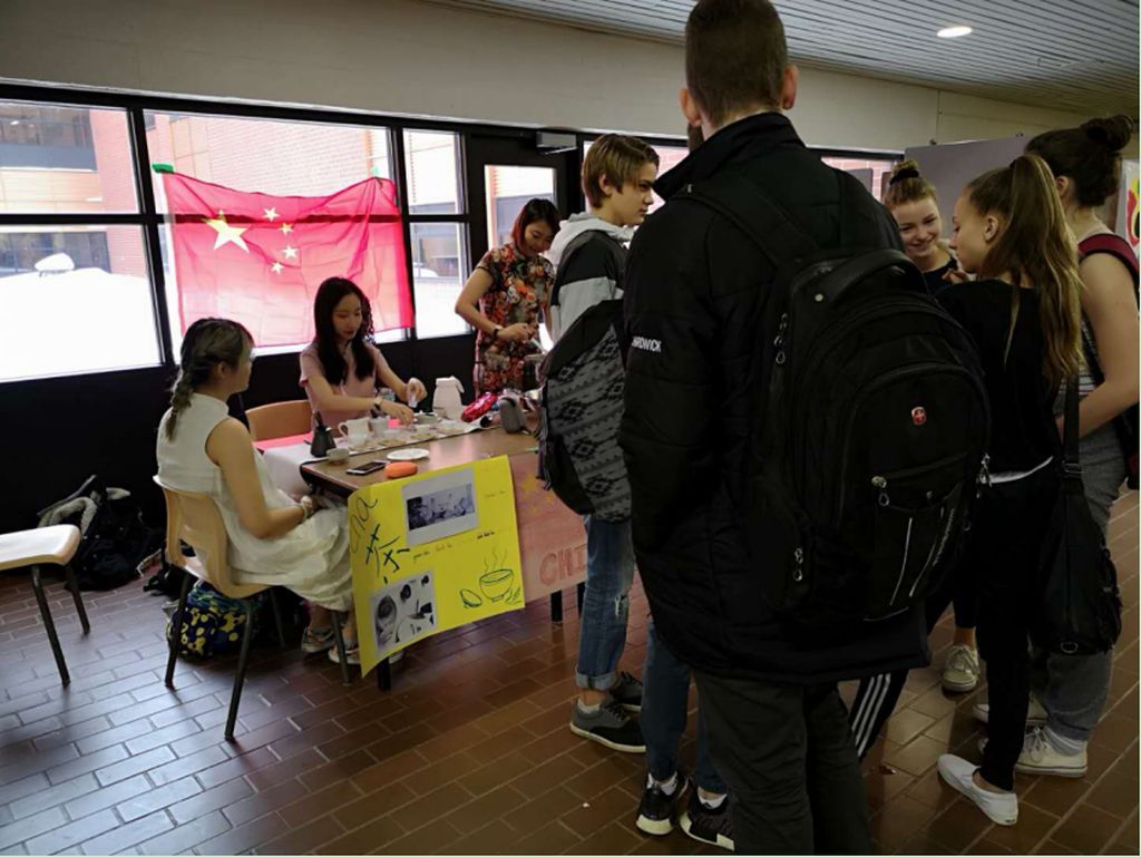 12月21日,汉语教师刘晓唯、志愿者许梦可参加Riverview High School 的多元文化美食节并设中国展台。展台共分茶艺、炒饭、筷子游戏、中国娃娃大头照四部分。许梦可用干泡法沏制了崂山红茶,雅致的茶具、专业的手法、醇和的口感大受欢迎。与这边兰亭雅叙相衬的是热情似火的中式炒饭,刘晓唯现场制作,热烈的翻炒与展台前排起的长龙如同集市般热闹,师生品尝后赞不绝口。