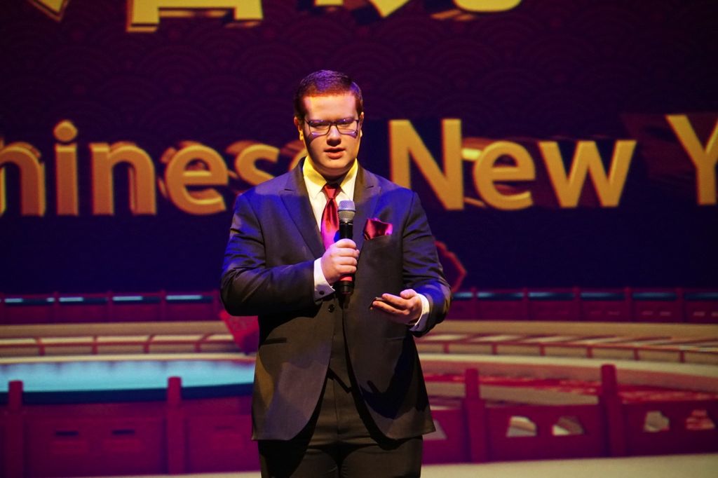他不仅是圣约翰近些年春晚舞台上首位中英双语主持的加拿大面孔,也作为全场唯一一位男生主持人承担着舞台大部分的报幕工作。在熟练掌握节目中文介绍的同时,他更是根据中文意思编写出地道的英文台词。