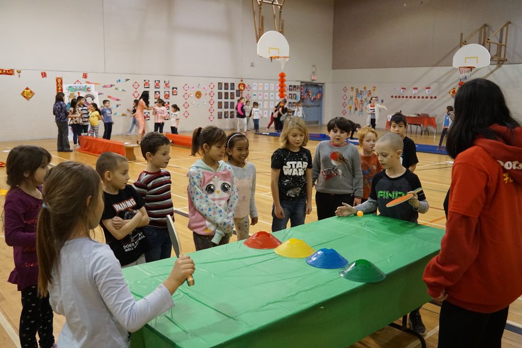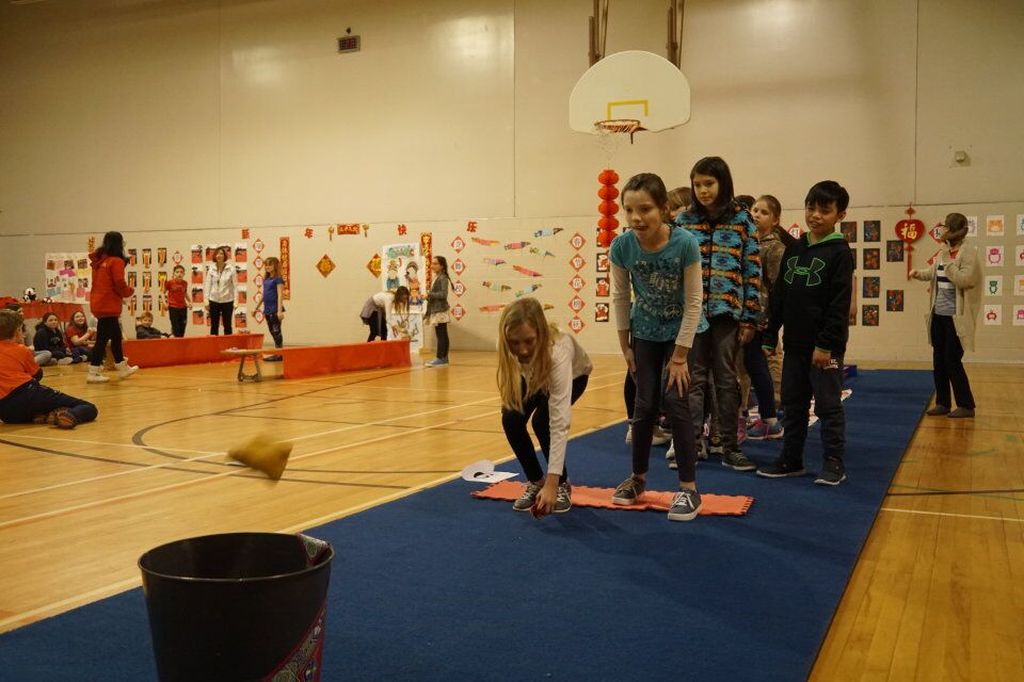 趣味横生的体育活动:武术专业教师梁嘉怡,在该校教授中国武术、舞蹈和啦啦操课程。新年之际,结合其体育专业的优势,带领全校各班级学生参与体验七项活动挑战赛,其中包括筷子夹球奔跑竞赛、转手帕、手脚协力青蛙跳、踢毽子、投沙袋、长袖舞、打乒乓球,还设有文化体验区猜灯谜、找出自己的属相等。各展台分别设置活动规则,按要求按时间完成者可获得“一元钱”,集齐三元钱,在最后可换取一个幸运饼干。全部顺利通过的学生,可获得新年红包。每班体验30分钟,让大家在这个中国新年一起“动”起来。活动结束后,各班学生可自选中国新年吉祥物一起合影留念。