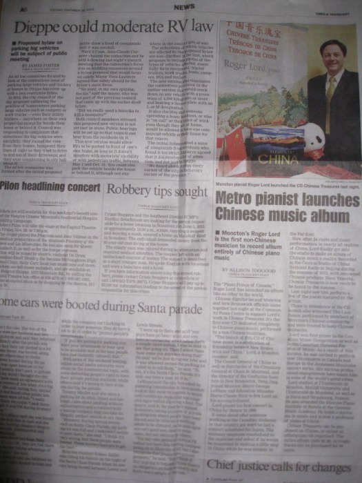 2013年11月25日晚,加拿大新布伦瑞克省孔子学院承办了素有“加拿大钢琴王子”之称的著名钢琴家、蒙克顿大学教授罗杰•罗德(Roger Lord)先生的"中国音乐瑰宝"CD发布会。此次发布会在蒙克顿市著名的Community Peace Center举行。包括新布伦瑞克省前省长在内的当地各界名流共二百多人来到发布会现场。中华人民共和国驻加拿大蒙特利尔总领事赵江平女士、蒙克顿市市长George LeBlanc先生、加拿大新布伦瑞克省教育部长Marie-Claude Blais 女士应邀出席并致辞。