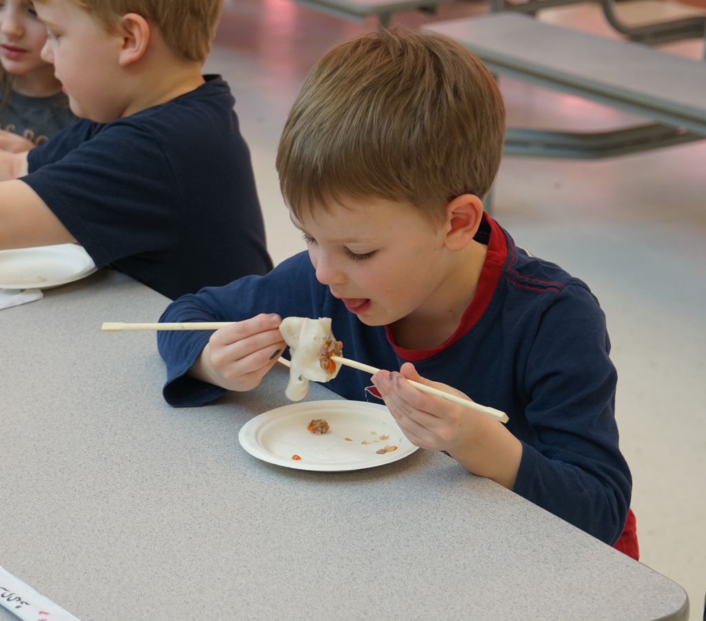 This celebration set different projects for different grades. Student of higher grades wrote Character “Fu” in the calligraphy experience zone; students of lower grades painted pandas; in the game area, the higher grades guessed riddles, and the lower grades did chopsticks games. However, the dumplings area did not have this kind of special care, no matter whether they were the children in the kindergarten or the big sisters in the eighth grade, they all made dumplings with their own hands and tasted their works in front of the steaming pot.
