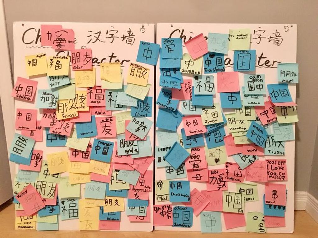 最受欢迎的是写汉字区,许多学生选择用汉字写“中国”、“加拿大”、“朋友”、“爱”等表达对中国汉字文化的喜爱,孩子们将一笔一划认真书写的汉字贴满了“汉字墙”。活动中许多老师和学生都表示此次多元文化展示最喜欢中国部分,“That’s really amazing!”是校长Weir女士对中国展区的评价。