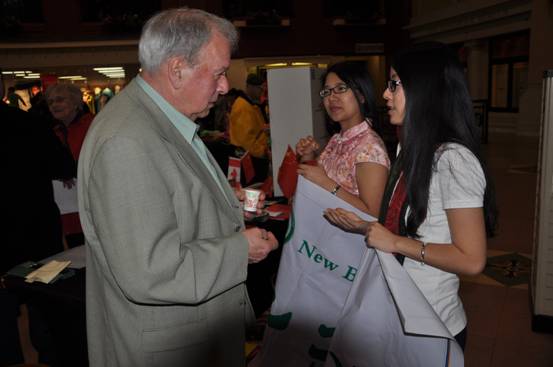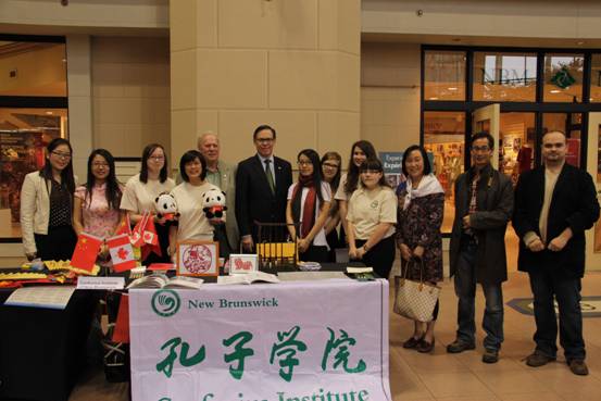 开幕式上,新布伦瑞克省孔子学院中国文化展台上摆满了中国结,笔墨纸砚,太极扇,脸谱等极具中国特色的物件,不断吸引人们来观看欣赏。很多人在孔院教师及学生的指导下尝试学习中国书法,试戴中国脸谱,更有对中国有了解研究的人们翻看中国旅游书籍 及中国地图。 圣约翰市文化部部长Bernard J. Cormier先生及圣约翰市议员也来到展台前欣赏中国传统文化, 并与孔院老师热烈讨论孔子儒家及中国传统文化。孔子学院学生在开幕式上表演了合唱《明天会更好》赢得了观众的热烈掌声。曾赴中国学习的孔子学院奖学金获得者黎松毅(Tevvin)志愿到展台前教授中国书法。