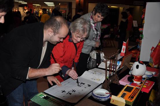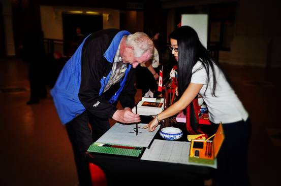 The Chinese culture exhibition of CINB filled with Chinese knitting,writing brush papers,Taichi Fan ,facial mask and so on,which attracted people coming to see. Many people tried to write Chinese calligraphy, put on facial mask, and read the books . Mr. Bernard J. Cormier , the cultural Affairs officer of Saint John and the City Counselor also came to the exhibition to acknowledge and talked about Confucius and Chinese culture with Chinese teachers.The students of CINB performed the Choir Tomorrow will be better on the opening ceremony and won warm applause and praise .Tevvin, who won Confucius Institute scholarship and learned in China,taught people Chinese calligraphy as a volunteer.