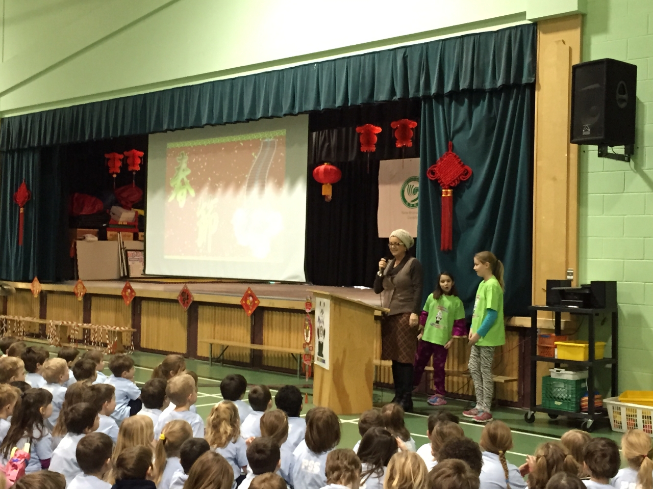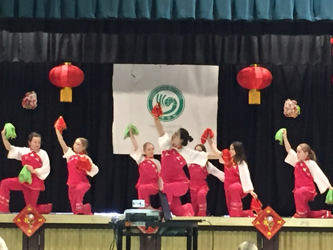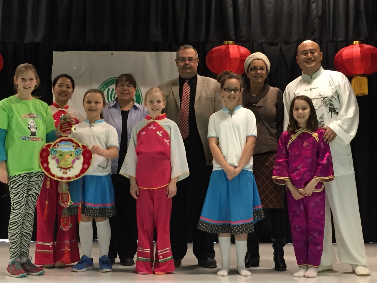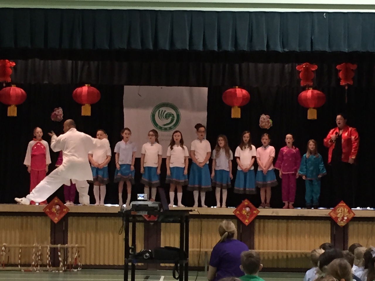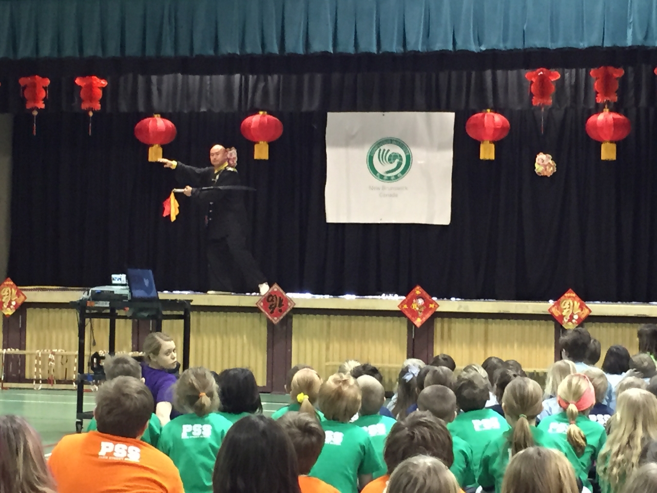 At the beginning of the event, the two MC who are the students in Grade 5 introduced some Chinese typical custom about Chinese New Year. And then Miss Xi and her dance club students performed a Chinese traditional umbrella dance titled <Jasmine Flower> and a handkerchief dance called <La Meizi> which sparked a very joyful atmosphere. The music teacher, Mrs. Wilson led the students perform two songs titled ‘Yangtze River’ and ‘Feng Yang Song’. Both of them were about Chinese culture. The highlight of the show came from Mr. Fazhou Fei, the Kung Fu Teacher of CINB, who performed Tai Ji sword and won a warm applause and cheers. Also, he was joined by Mme. Aube and a group of Park Street Students performed <Tai Ji> which had been performed in the Play House for Chinese New Year Gala of Fredericton.