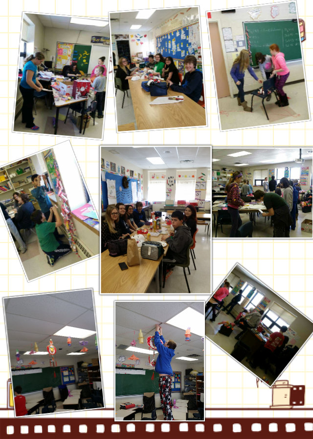 然而最难忘的还是2015年忙碌的春节!春节前,通过角色扮演的方式介绍了十二生肖,孩子们的热情很高,在欢笑声中记住了十二个属相。全班齐动手剪纸,做灯笼,挂 “鞭炮”,贴春联,忙的不亦乐乎!2015年2月19号这天,Harkin中学的主题叫“中国年”!我和学生们一起包饺子过大年,孩子们排队进入烹饪教室,有条不紊地分工合作,连同我提前花了七个小时包的饺子,总共包了三百多个饺子,全校师生一起分享,孩子们称赞这是他们吃过的最好吃的饺子!Carrie 对我和孩子们进行了采访,并做成视频,若干年后这将是我和孩子们最美好的记忆!Jennifer很贴心地让我在广播里祝福全校新年快乐!当中国新年的音乐响起时,我的心情很复杂…….这天的Harkin中学,几乎所有人都在讨论中国年;几乎所有人都在跟我说:新年快乐!