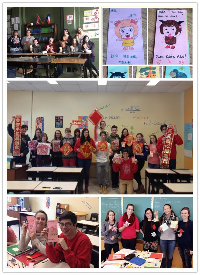 The Chinese teacher Jie Jiang is teaching two high schools at present. Spring Festival is the most important traditional festival for Chinese people.In order to making students know more about traditional Chinese culture , Miss Jiang planned the spring Festival theme culture week activities . The theme includes different Chinese cultures, just like spring festival stories, paper cutting ,making new year card ,sending red envelops and watching CCTV New Year Gala. The also made a celebration around the school to introduce Spring Festival culture.