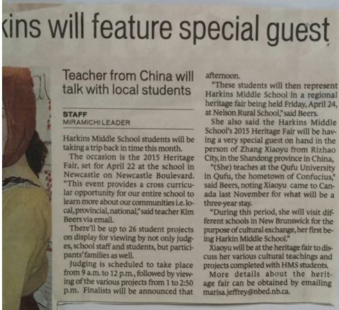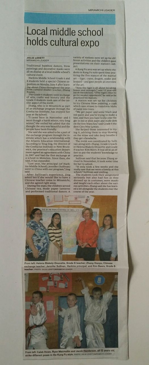 In Miramichi and at Harkins, there are so many people I need to say thank you. Thanks to the principal Jennifer who gave me enough space to do what I wanted to, gave me enough trust to let me do it better, and gave me care and consideration to make me feel at home. She always introduced me to the right person, took me to the right place, and guided me to do the right thing. Thanks to the Brazilian exchange student Joao and his friends for giving me so much encouragement and happiness. Thanks to my homestay aunt Jane for comforting me in her unique way. Thanks to Donald for telling me in person I was actually very powerful. Thanks to the school secretary Margaret for everything she had done for me. Thank to Mr. Hache’s friendly teasing, which helped me interact into the whole team more easily and become a member of Harkins. Thanks to Juxia who let me know more new friends, and thanks to them for remembering me. Thanks to Mary, the exchange teacher from Columbia, for her teaching experience and humor. Thanks to Helena and her blue team for being the first group at Harkins to work with me and help me. Thanks to Mrs. Beers and her excellent students from Grade seven and Grade eight. Thanks to all the teachers and students of HMS for accepting and helping me! I will thank them for being willing to know me, to know my country, and meanwhile helping me understand a real Canada! I believe that cultural communication is a way of learning from each other. Here, in Miramichi and at HMS, we are an international family!