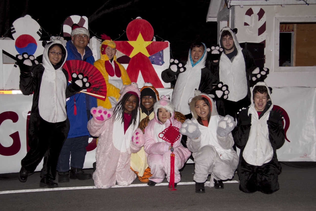 27日晚六点,一年一度的圣诞节花车游行在蒙克顿市举行,近百辆装饰绚丽,个性显著的圣诞节花车从Vaughn Harvey街出发, 途径市中心主要街道Main Street,历经两小时到达Champlain Mall结束,活动吸引了蒙克顿市及周边城市近十万人次参观。孔子学院学生和八名教师志愿者在外方院长滕菁女士和中方院长李敏红女士的带领下,与孔子学院下设汉语课堂学校Harrison Trimble High School的花车队伍一起进行花车游行展示。他们身着十二生肖和大熊猫的服装,手拿孔子学院的横幅,太极功夫的扇子与中国结,走在美轮美奂的队伍前,亲切地与街道两旁的参观人群互动,学生们也在活动中学到了太极功夫及用中文表达圣诞节快乐。