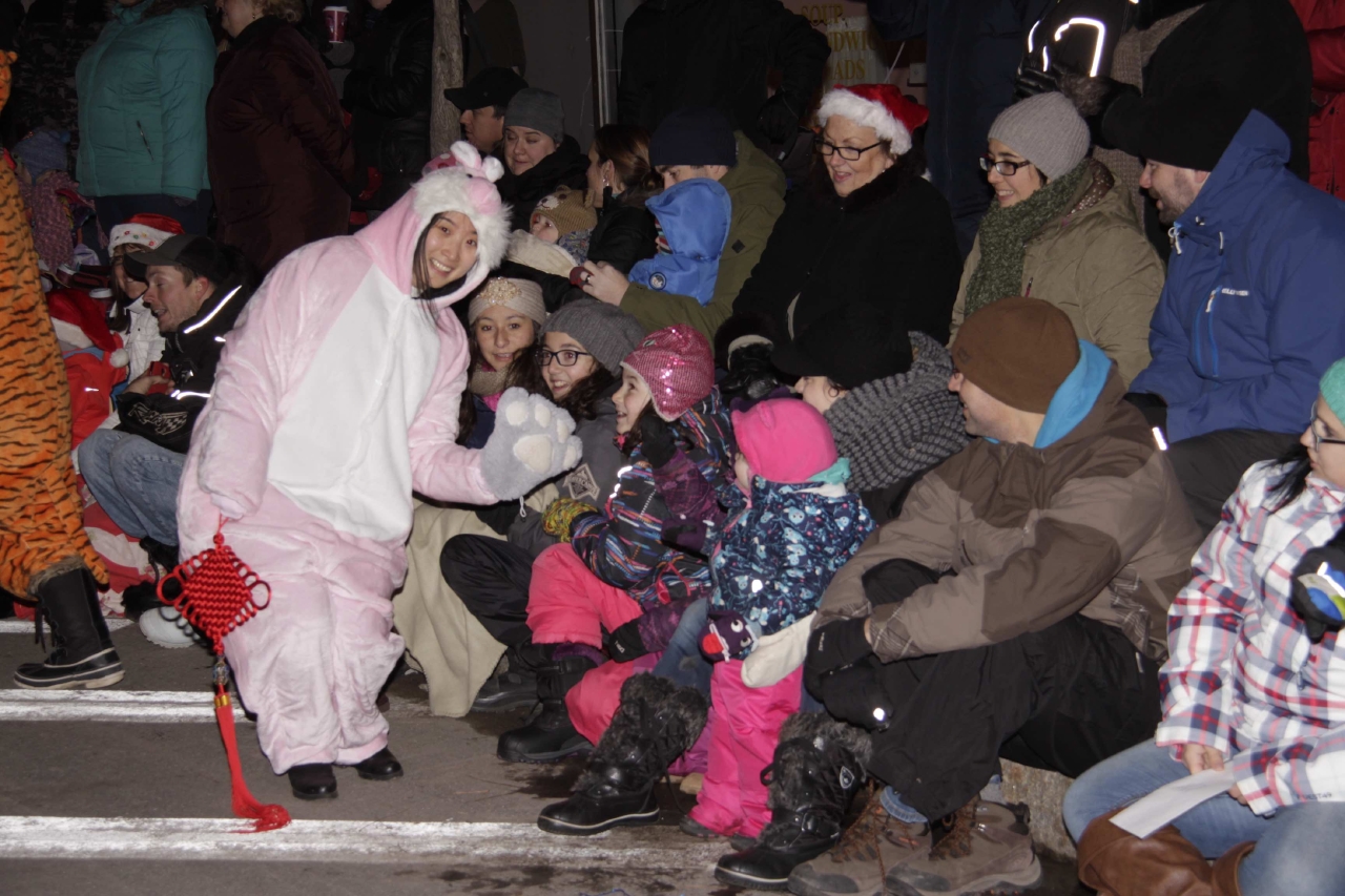 The Majesta Greater Moncton Santa Claus Parade attracted around 100 floats and 100,000 audiences from all over New Brunswick this year. Leading by Mrs. Teng Jing, foreign director of CINB, and Mrs. Li Minhong, Chinese director of CINB, eight teachers and volunteers from CINB, dressed up in 12 Chinese zodiac animals and panda costumes , holding a big banner of CINB and Chinese kongfu fans, walked in the parade along with students from HTHS. Audiences on both sides of the road said hello to the parade of CINB, and kids rushed to the fore to shake hands with Giant Pandas and dragons and hugged volunteers and some kids tried to say hello in Chinese to them. Students from CINB also learned how to use Taichi fan and how to express “Merry Christmas ” in Chinese.