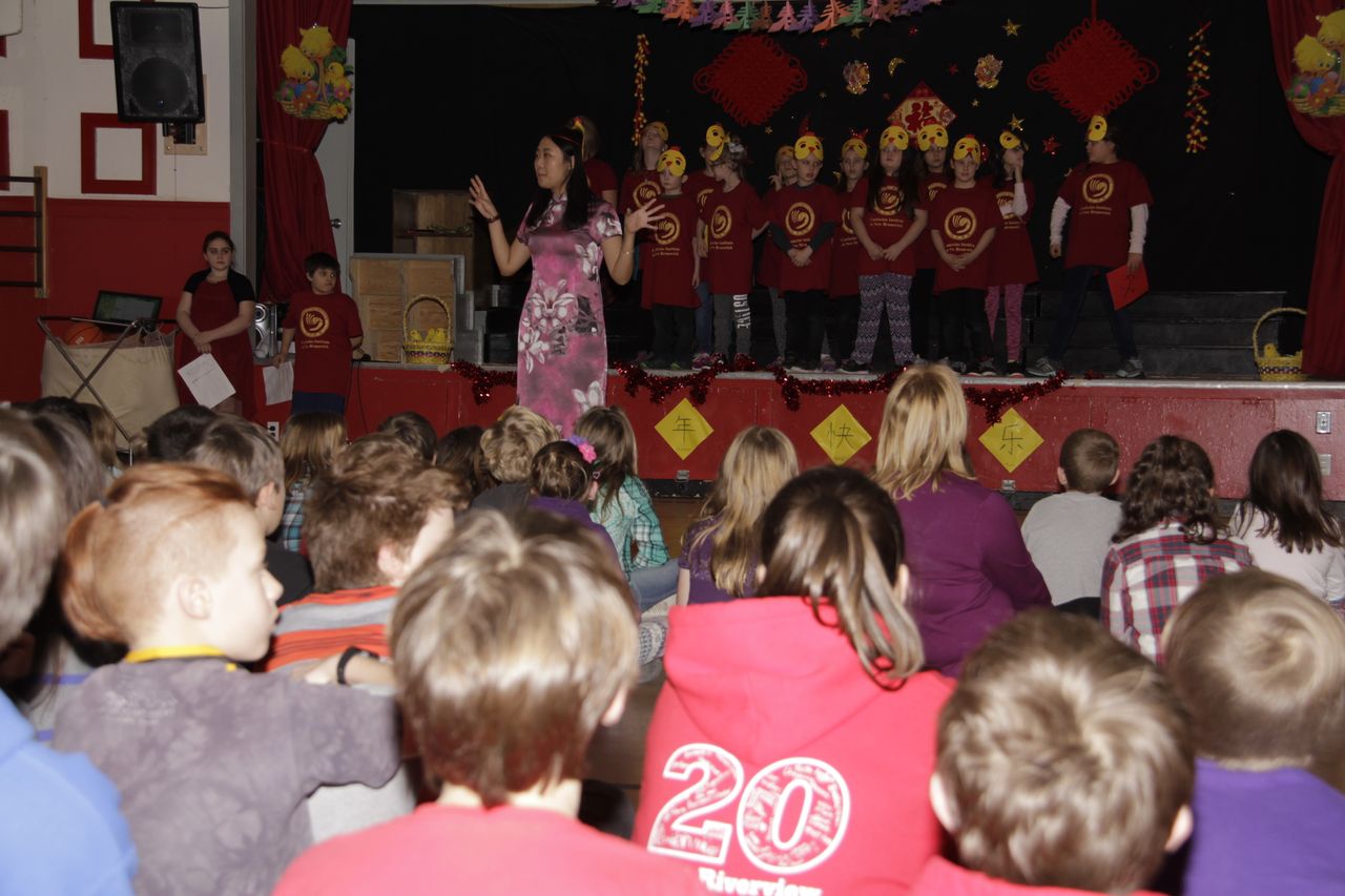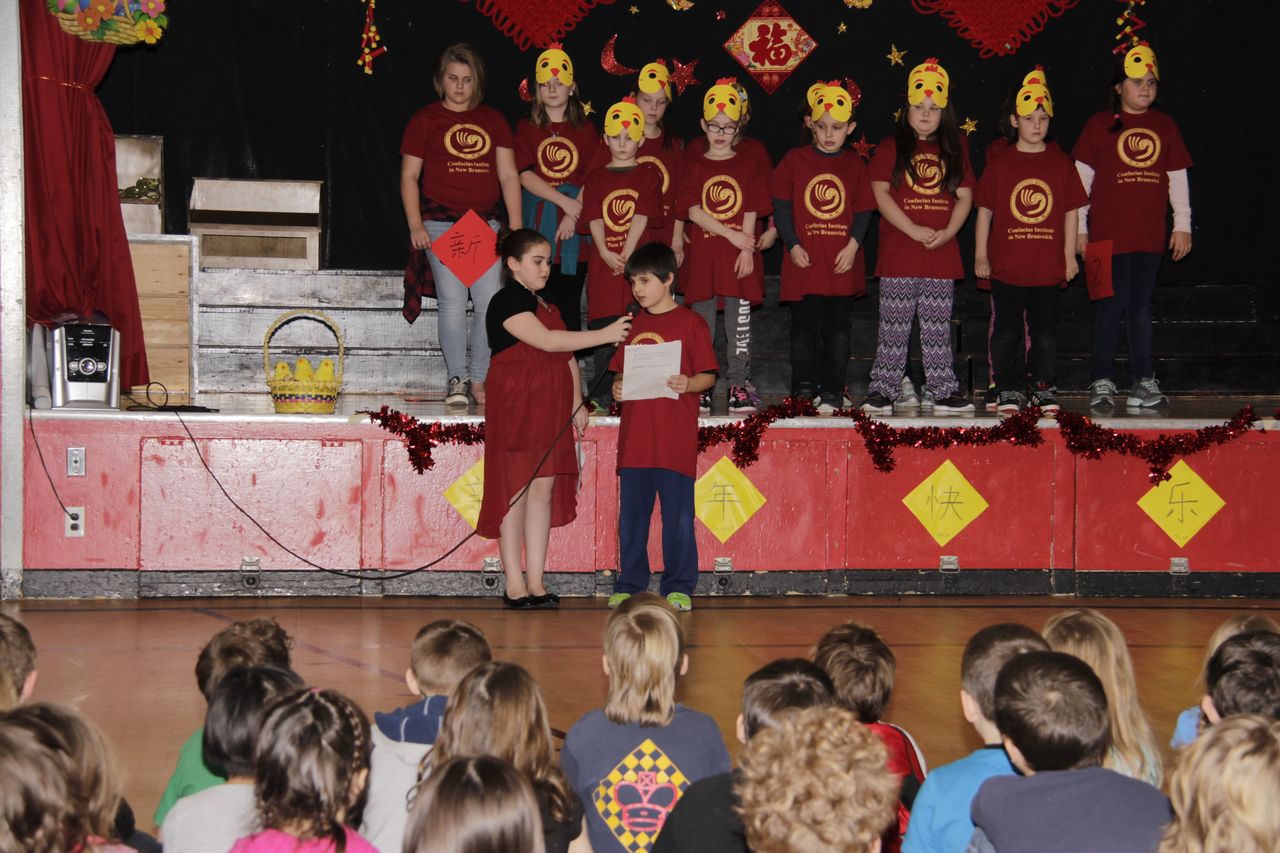 Some of grade 4 and grade 5 children brought the opening performance with a Chinese song "Wish You A Happy New Year" for everyone. Then, they brought us a lively and lovely song "Two Little Chickens", each child wearing the chicken mask which is the symbol of the year of the rooster, the New Year's blessing and vitality through the song dedicated to everyone here.