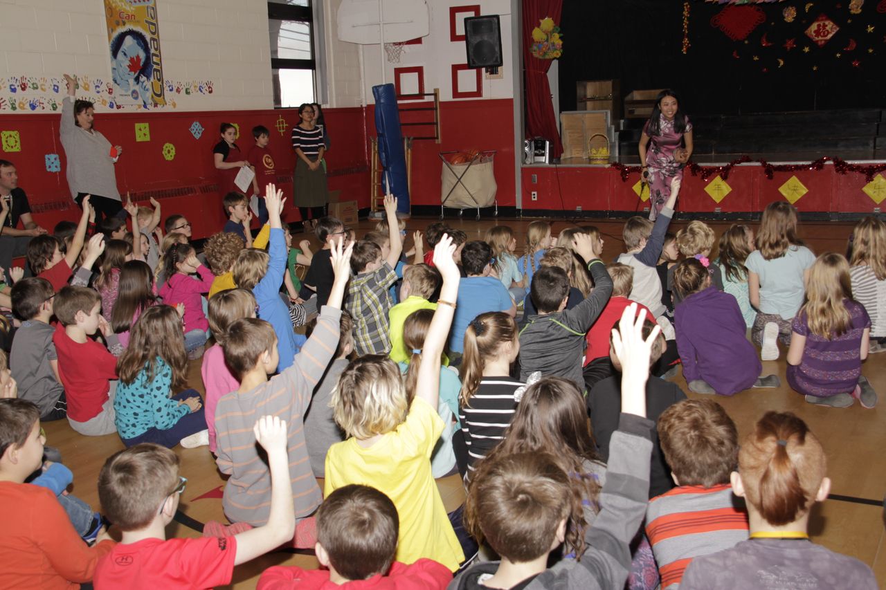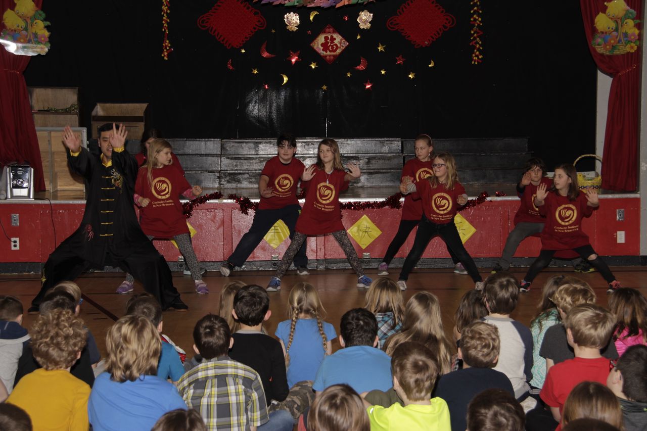 来自四年级的Dathen和来自五年级的Macy是当天的小主持人。他们给同学们分享在课堂上学到的中国新年的花样年俗。此时,一只小小舞龙队的突然出现让现场的小朋友们纷纷激动起来。这支由四年级男孩子们组成的小小舞龙队将手工制作的布龙表演的活灵活现。现场热烈的欢呼让联欢会的气氛高涨了起来。