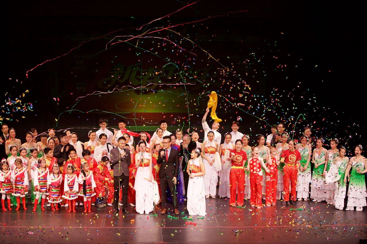 当天晚上剧场内座无虚席,演员队伍阵容强大,为观众朋友们送上了一台美轮美奂的精彩春晚。孔子学院的教学单位Park street小学二十余人参加演出。学生年龄从7岁到10岁不等,出于对中国文化的热爱,学生和家长们积极配合练习和彩排,汉语志愿者教师陈俊锋、王静丽带着孩子们给观众献上了活泼可爱的舞蹈表演,汉语教师郑晓婵 和Mr. Landry 演唱了歌曲《唱脸谱》,节目最后孔子学院师生共同祝福大家新年快乐,表演得到了观众们热烈的掌声。